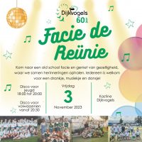 Omdat Dijkvogels 60 jaar bestaat is het tijd voor een ouderwets, gezellig reünie facie, waarbij alle leden én oud-leden welkom zijn. We hopen dat er veel oud-leden zijn die het gezellig vinden om weer eens bij te kletsen met een drankje, muziek en dansje 🥳